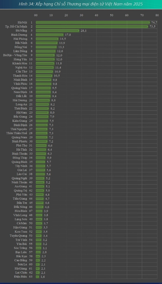 Điểm trung bình của 63 tỉnh, thành chỉ 9,3 điểm. Khoảng cách giữa địa phương dẫn đầu và địa phương thấp nhất lên tới 73,1 điểm, cho thấy TMĐT vẫn tập trung chủ yếu tại hai trung tâm kinh tế lớn, trong khi nhiều tỉnh thành khác còn ở giai đoạn rất sơ khai.